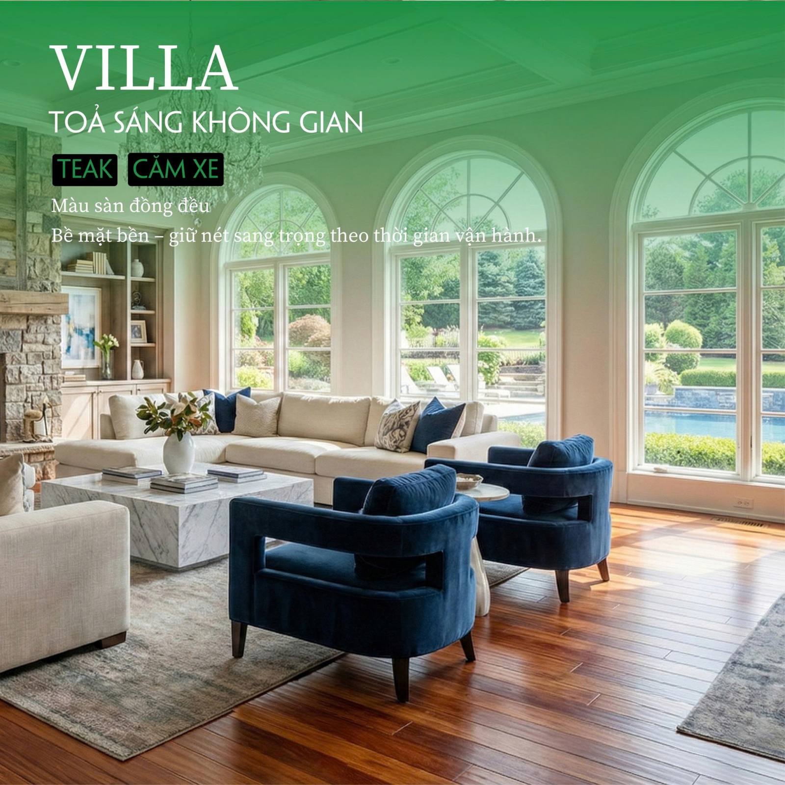 Đối với các công trình biệt thự, villa cao cấp, sàn gỗ không chỉ là vật liệu hoàn thiện mà còn là yếu tố thể hiện đẳng cấp. Chiêu liêu, Giáng hương với màu sắc sang trọng, vân gỗ nổi bật sẽ tạo điểm nhấn rõ rệt, nâng tầm toàn bộ không gian sống.