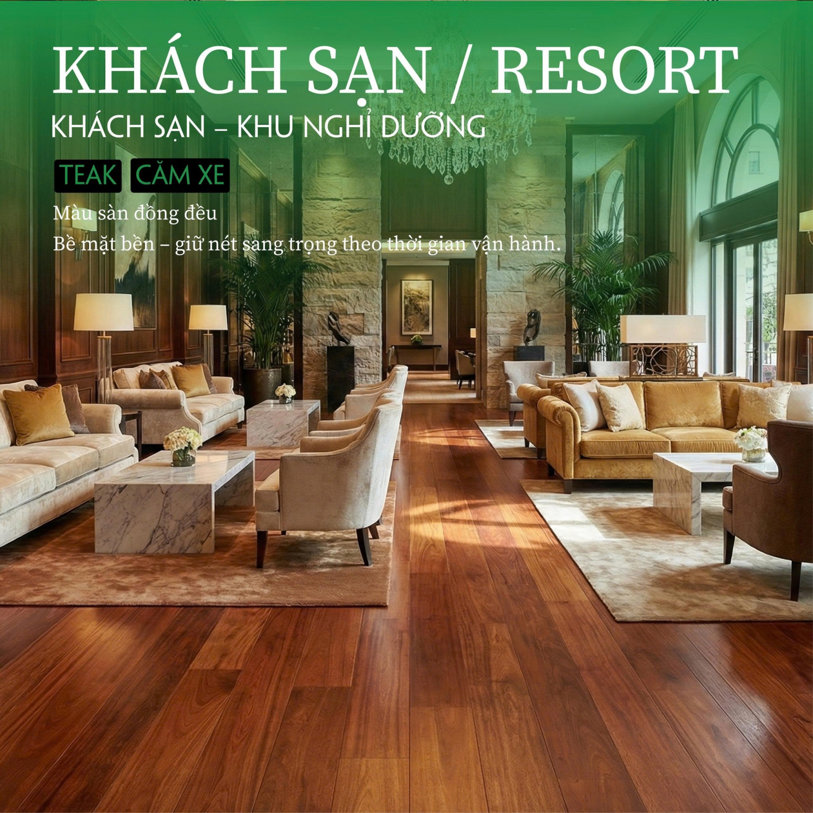 Với tần suất sử dụng cao, khách sạn và resort cần sàn gỗ có độ ổn định tốt, bền mặt và giữ màu lâu. Tếch và căm xe là hai dòng gỗ được sử dụng phổ biến nhờ khả năng chịu lực tốt, giữ vẻ sang trọng ổn định theo thời gian.