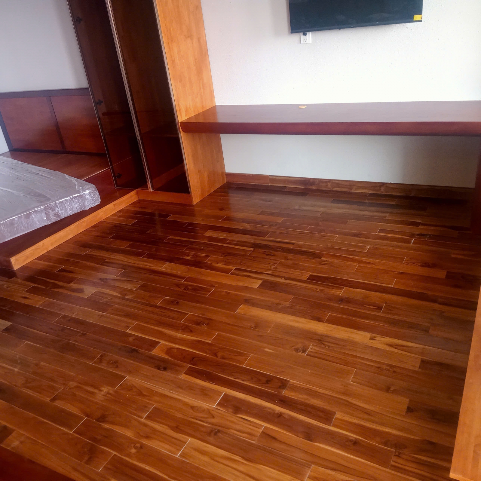 Trên thực tế, nhiều căn hộ cao cấp và chung cư hiện đại sử dụng sàn gỗ tự nhiên cho phòng khách, phòng ngủ hoặc phòng làm việc để tăng tính thẩm mỹ.