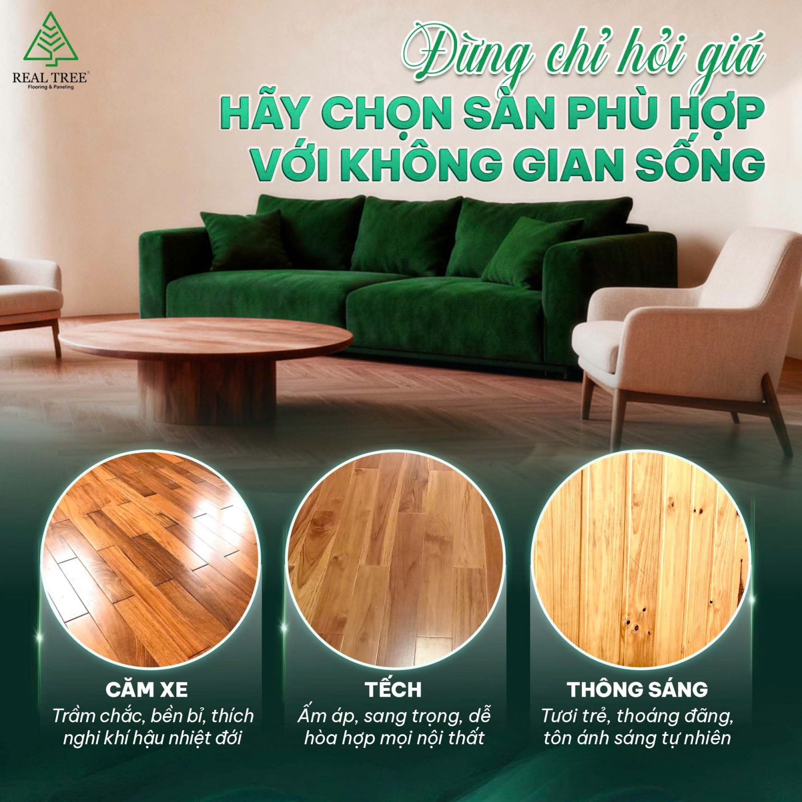 Nếu bạn đang phân vân giữa nhiều loại sàn gỗ và chưa biết lựa chọn nào phù hợp với không gian sống của mình, bạn có thể gửi hình ảnh thực tế và mục đích sử dụng cho RealTree. Đội ngũ sẽ tư vấn tone màu, quy cách lắp đặt và phương án xử lý bề mặt phù hợp nhất cho từng công trình.