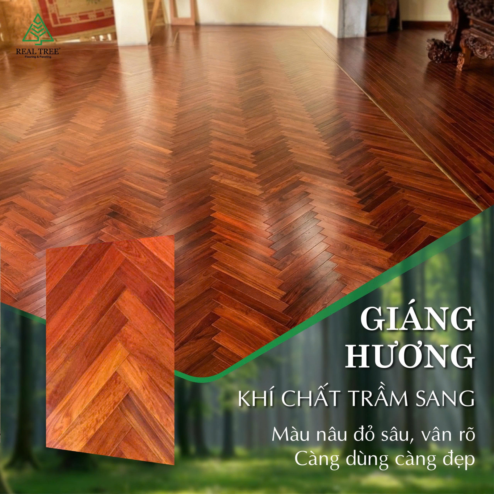 Giáng Hương là loại gỗ mang cảm giác trầm – sâu – đậm bản sắc. Màu gỗ thiên về đỏ nâu, khi lên sàn tạo hiệu ứng không gian có chiều sâu rõ rệt. Đây là loại gỗ không tạo ấn tượng nhẹ nhàng ngay từ đầu, nhưng càng nhìn càng thấy “có lực”.