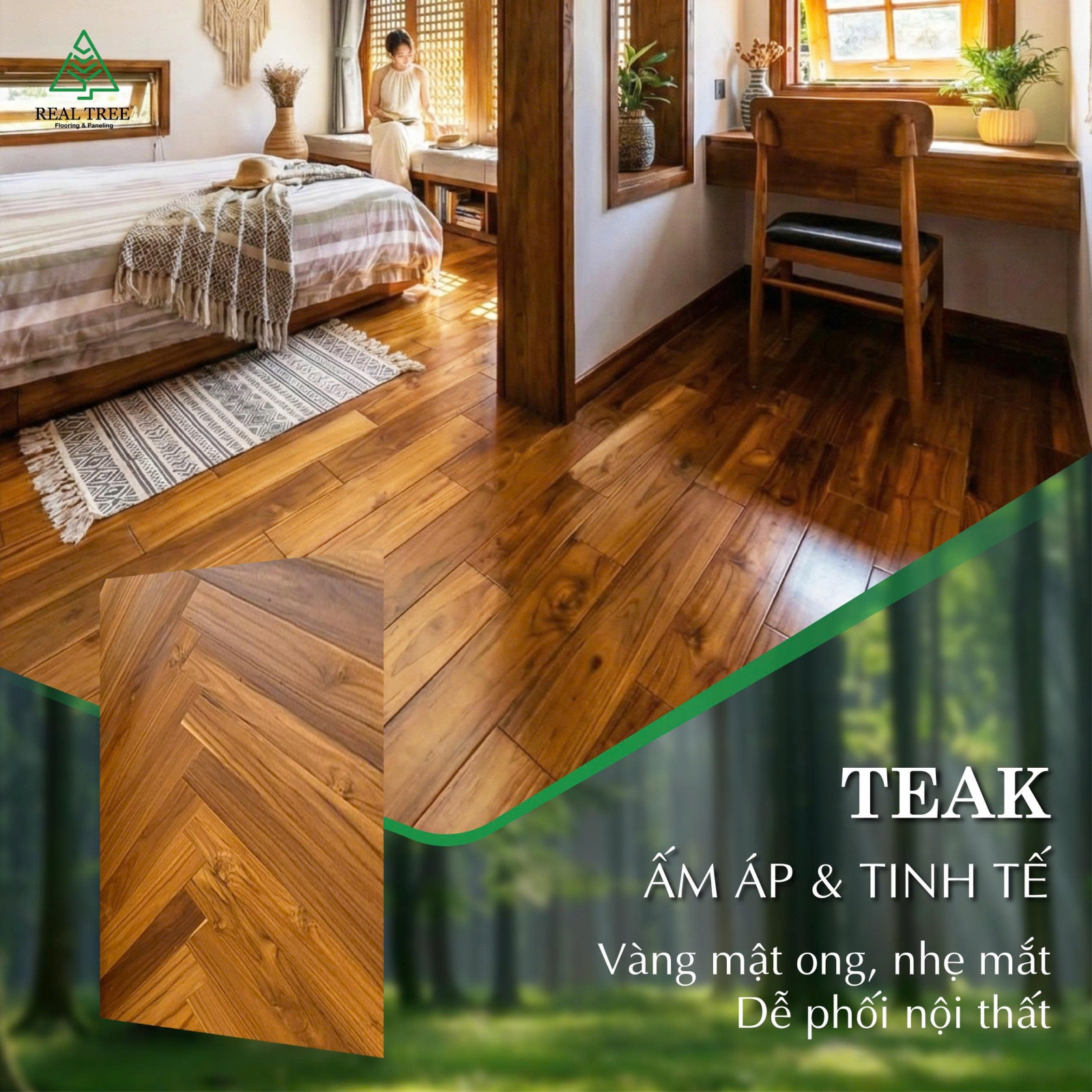 Teak mang một cảm giác hoàn toàn khác. Màu gỗ như mật ong ánh vàng, sáng vừa phải, không chói cũng không trầm. Khi ánh sáng rơi xuống mặt sàn, không gian trở nên ấm hơn nhưng vẫn giữ được sự nhẹ nhàng và thanh thoát.