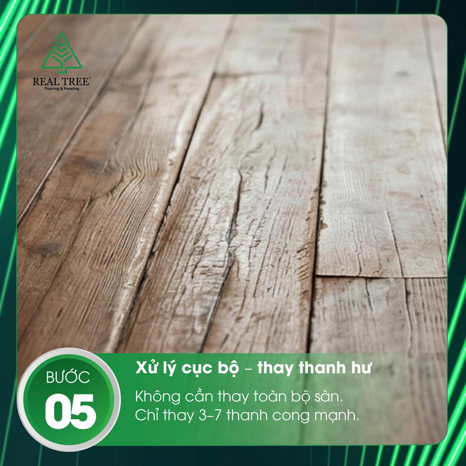 Kỹ thuật viên sẽ tháo từng thanh, xử lý điểm nền và lắp thanh mới đồng màu, không cần thay cả sàn.
